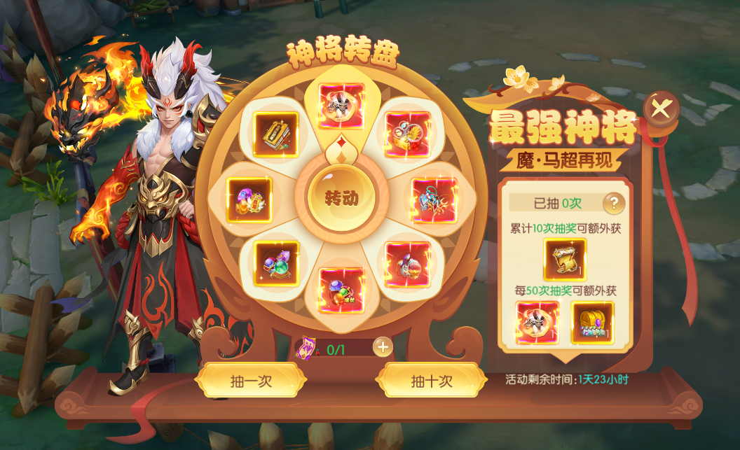 活动介绍:使用神将寻宝券可以获取最强神将-魔·马超,还有更多极品道具。累次次数每达到10次和50次可以获得额外奖励,寻宝券需要通过购买神将礼包获得。