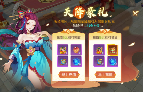 活动介绍:活动期间,充值指定金额可开启限时礼包。
