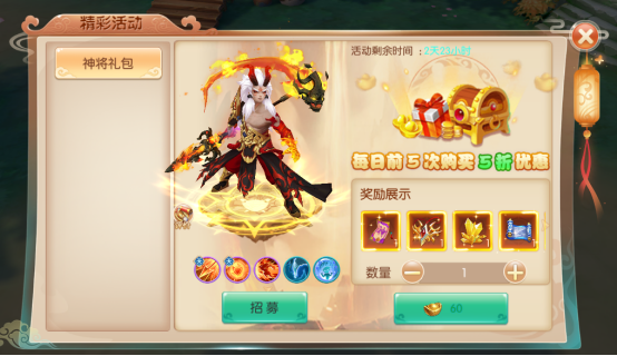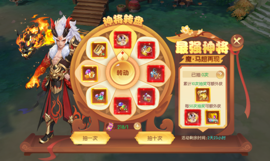 活动介绍:购买神将礼包可以获得神将寻宝券,用于在神将转盘抽取最强神将魔·马超。礼包每天前五次购买半价!