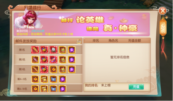 活动介绍:活动期间内玩家累计充值达到一定排名即可获得极品大奖,前三名可以获得天地神盒和极品称号等奖励
